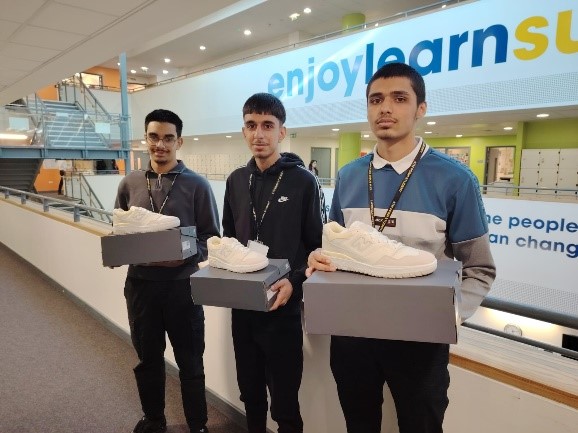 14 of our Sixth Form students were given the opportunity to visit the New Balance headquarters in Warrington last week. The opportunity came about as a result of some work Ms. Holmes did last year with an organisation called Revolution Hive. They have a strong relationship with the Eze Foundation and its leader, Ikechi Eza, whose mission is to empower young people by providing them with invaluable opportunities and experiences in the working world. As part of the day they met football boot designers, kit designers and sports management teams. The students were tasked with creating their own designs throughout the day and then present them to the group and the experts from New Balance. Our student were incredible and the feedback from New Balance and the Eze Foundation is some of the best I have ever read.Here are a few pictures from the day and a few of the prizes won by our students including the prototype football boots to be worn by Ebe Eze when he next plays in the Premier League!