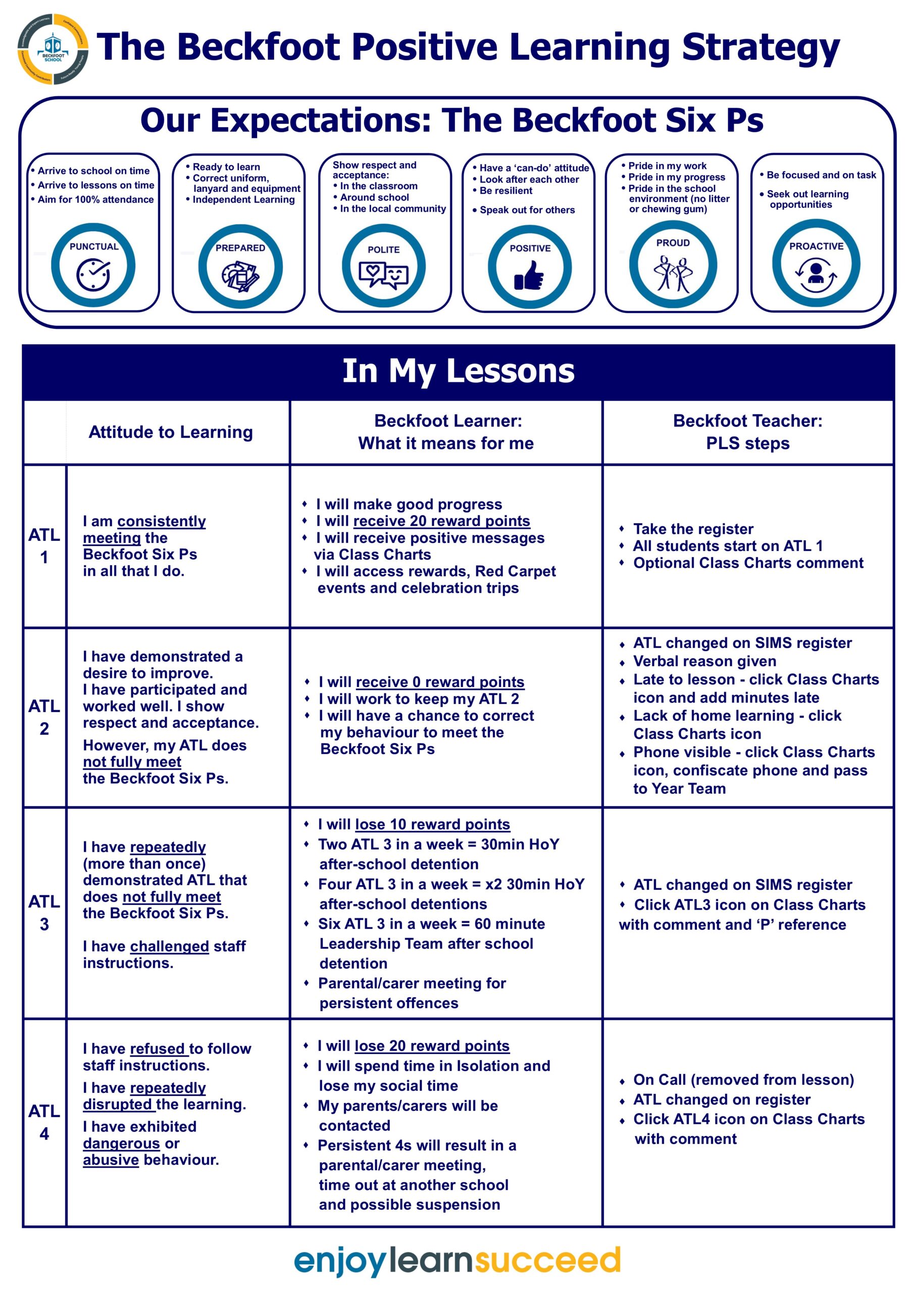 At Beckfoot, we work hard to embed a culture where students attend every day, are active in their learning, independent and resilient to challenge and change. This is shared and supported by our parent body. Beckfoot School creates a climate where learners feel safe and are rewarded for excellent attendance and positive behaviour. However, we also understand that some students will need support and guidance to ensure that they make the correct choices to enjoy, learn and succeed.